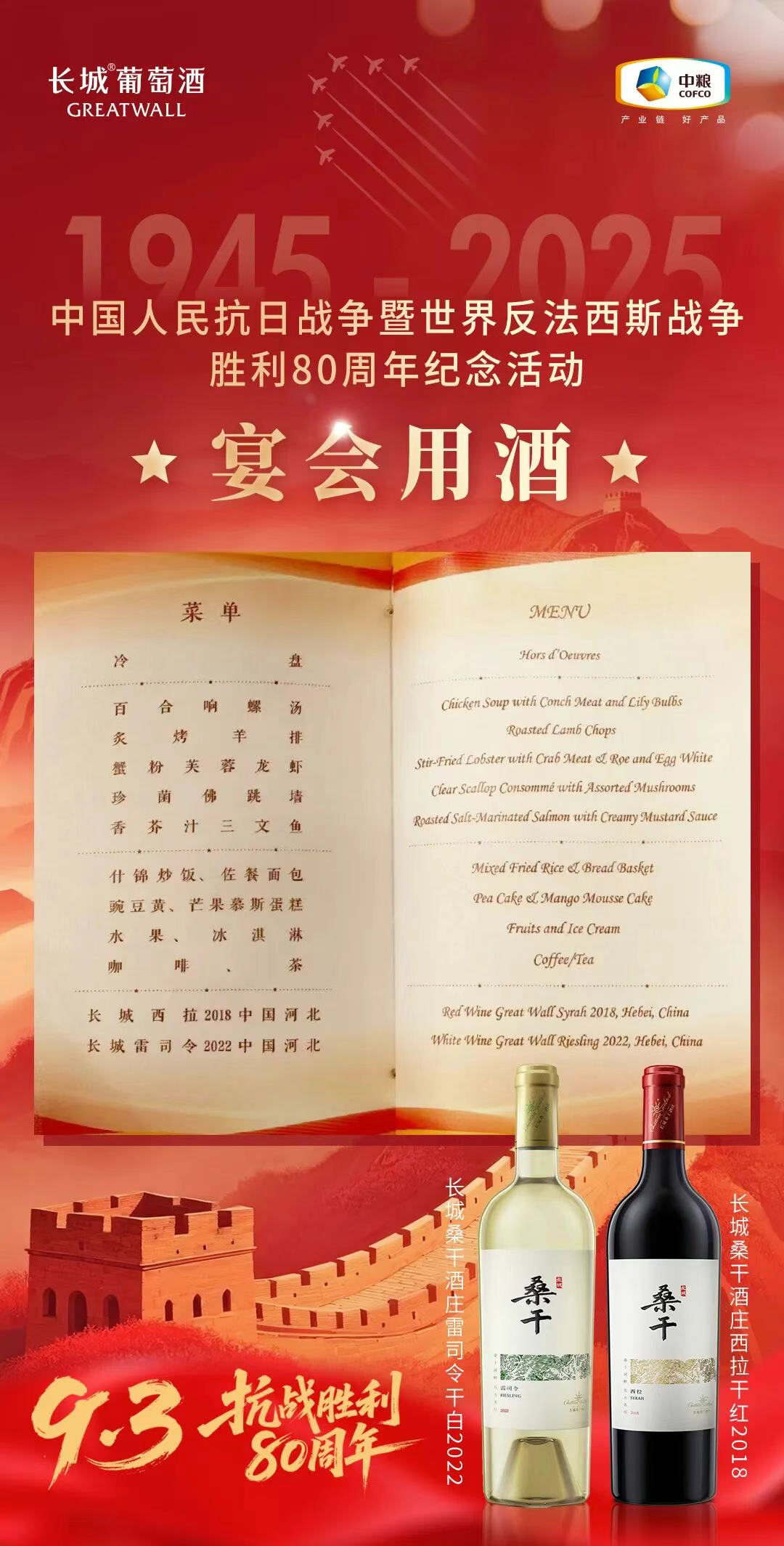 2025年9月3日,中国人民抗日战争暨世界反法西斯战争胜利80周年的纪念活动招待会上,长城桑干酒庄西拉干红葡萄酒2018与长城桑干酒庄雷司令干白葡萄酒2022荣登盛宴,展现大国的风度与底蕴。