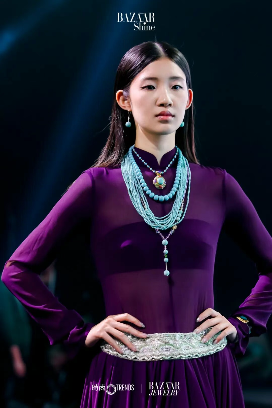 活动上,蒋勤勤、袁姗姗、王阳、张晋、赵雅芝等艺人通过深情讲述,从神话溯源、文化脉络到匠心精神,层层递进展开叙述这一东方宝石的千年故事;歌手黄英则以一曲《传承之花》倾情献唱,用歌声传递着文化传承的动人力量。“三寸盛京”东方国潮华服创始人张突然,以其标志性的设计哲学,将绿松石这一“东方瑰宝”无缝织入中式华服的脉络之中。