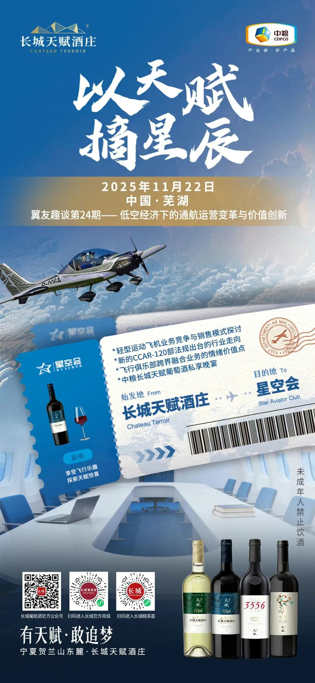 当星河低垂,大地静谧,总有一群人以梦想为舟,以激情为帆,在天空与大地之间书写着属于这个时代的传奇。11月22日,安徽芜湖东方飞谷航空飞行营地,一场思想的风暴如期而至。由星空会主办、中粮长城天赋酒庄特别赞助的“翼友趣谈”主题活动,以“低空经济下的通航运营变革与价值创新”为题,汇聚三十余位行业精英。