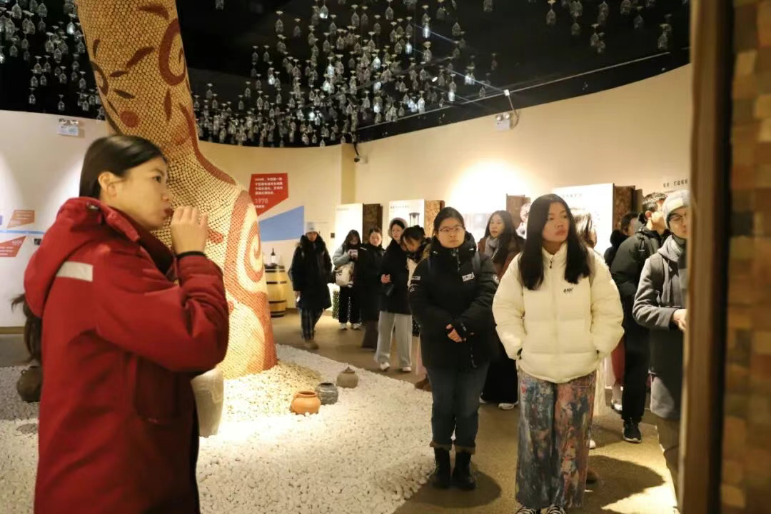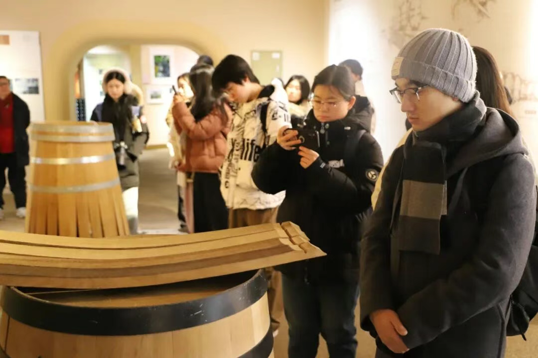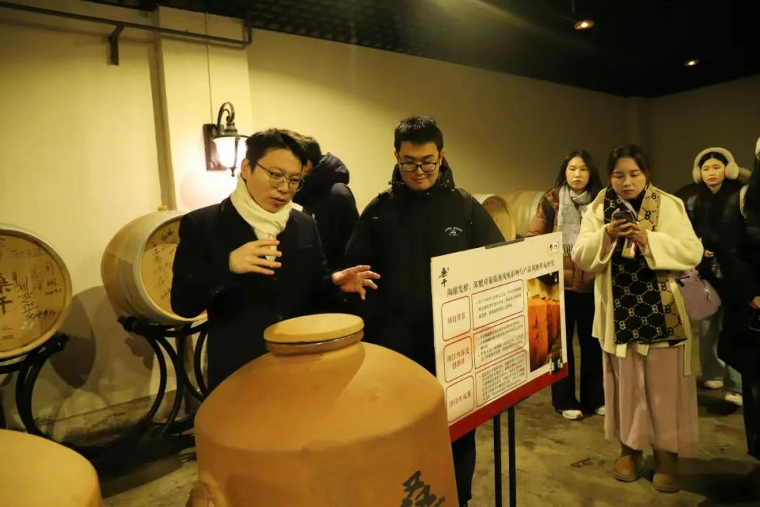 在长城桑干酒庄的冬季葡萄园,中国农业大学酿酒工程系系主任游义琳向同学们介绍了长城酒业如何挖掘中国风土,酿造国宴用酒的原料生产过程;黄卫东教授与战吉宬教授分别带领学生,深入走访了现代化的酒窖与酒庄博物馆。随后的行程中,学子们还探访了长城沙城工厂,参观了其标志性的万吨水泥窖池,实地了解了规模化酿造的传统工艺与现代技术。