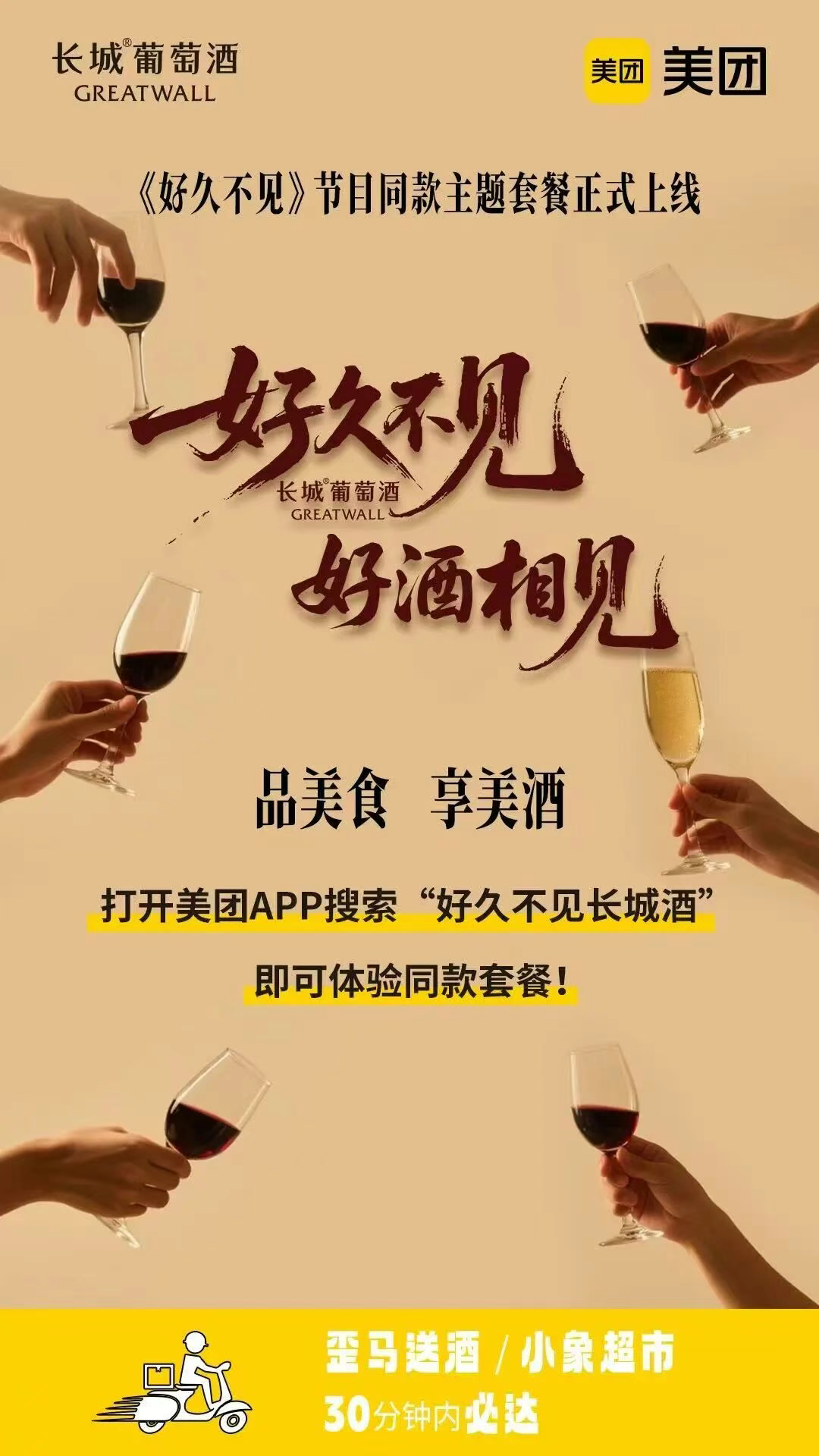 或打开美团APP,搜索【好久不见长城酒】,即可一键直达活动主题会场,轻松获取同款套餐信息,在线预订美味席位。